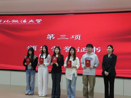 仪式上,丁艳艳宣读了获奖学生名单,李芸尔、孟德文为获奖学生颁发荣誉证书。获奖学生代表哲学与社会发展学院曾梓清、民商法学院朱馨彤同学依次发言。她们汇报了个人成长取得的成绩和体会,代表所有获奖学生,对岳成律师事务所表示深深的感谢,并表态将会珍惜荣誉、努力拼搏,以积极奋进的姿态绽放青春光彩。
